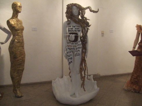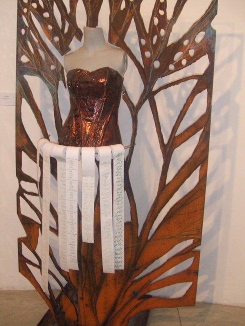 "אישה-בובה/בובה-אישה של שביט נוגה. שביט היא צורפת היוצרת תכשיטים וחפצי יודאיקה ובמיצג הבובות שילבה את מיומנות העבודה במתכת עם הרעיון של אישה במחוך מתכת נוקשה הצומחת מתוך שורשים המשתרגים לענפים, כאשר על סרטי נייר רשומים תפקידיה של האישה.