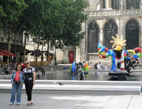 מול המזרקה עם הפסל של ניקי דה סן-פאל באיזור לה-האל במזג אוויר מושלם (אני משמאל)