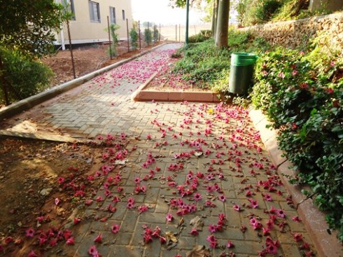 אתמול יצאתי לצעוד, כמעט כמו בכל בוקר. היה בוקר רגיל של תחילת הקיץ. עברתי באותו השביל שבו אני עוברת כל בוקר. כמעט. מישהו עבר שם בלילה ופיזר ערימות של פרחים ורודים. לא חתונה. לא אירוע חגיגי. לא קבלת פנים לאדם חשוב. סתם יום של חול, כמו זה שהיה לפניו וזה שיבוא אחריו.