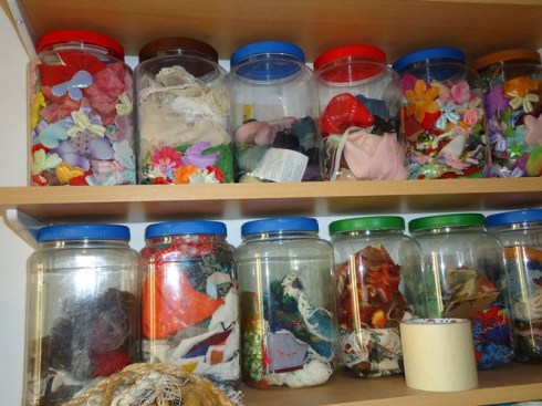 איסוף חומרים ליצירה- ערימות של חוטים, בדים, כפתורים ועוד תמצאו בכמויות אצל כל אחת משתינו.