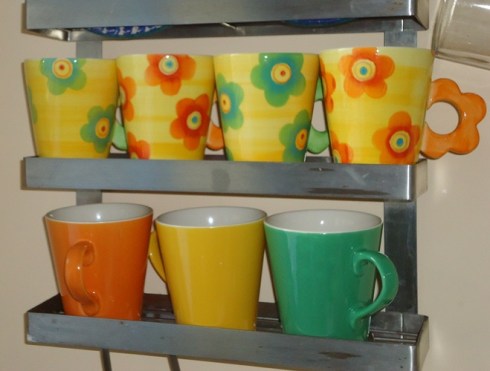 ספלי התה העליזים בדגם פרחים, שהביאה לנו במתנה, שרון, הבת הגדולה שלנו.