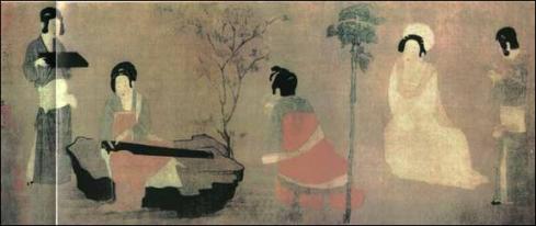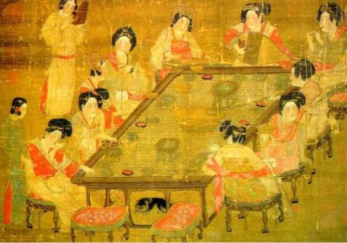 בתמונה זו, נראים שנים עשר משרתים מלכותיים, היושבים מסביב לשולחן, חלקם מנגנים בכלי נגינה, חלקם משחקים במשחקים שונים, בעוד האחרים נהנים מן הטעם של משקה תה טרי. תמונה זו צוירה על מרקם משי לפני יותר מאלף שנה. ולמרות שהמשי כבר נפגם במקומות שונים- הצבע של התמונה נותר בהיר ורענן. אנחנו יכולים אפילו להבחין בין הדיגומים השונים על בגדי המשרתות וגם בהבדלי האיפור שלהם. זהו ממצא בעל ערך רב המתאר את חיי המלוכה של שושלת טאנג.