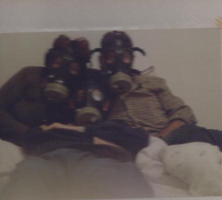 דני ואני עם מסכות גז ב"חדר האטום"