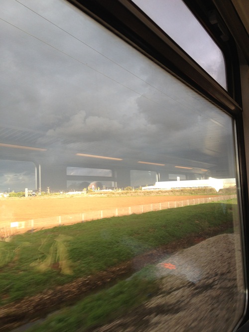 כשאני חוזרת הביתה ברכבת משתנה מזג האוויר הנאה לסגרירי ואפור. סוג של עצב קוסמי.