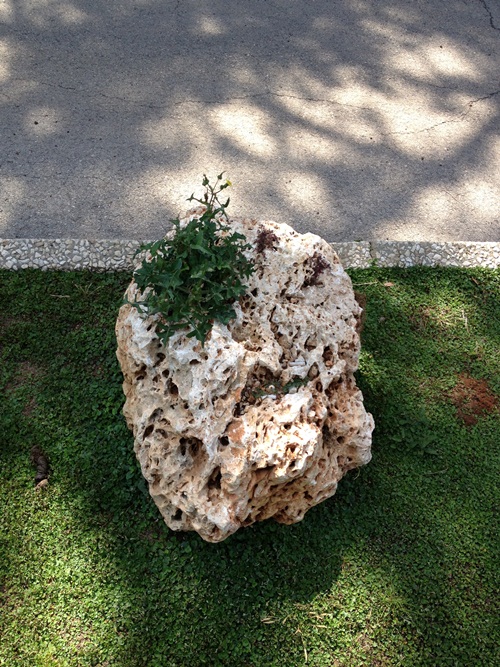 בהמשך הצעידה גיליתי כי בתוך אחד מסלעי הגיר הנקבוביים שהונחו על הדשא צמח סביון. התבוננתי בו מקרוב ותהיתי איך הצליח זרע מנוצה של סביון לעוף ברוח ולהכות שורש בתוך נקבובית של סלע צחיח. תהיתי על כוח ההישרדות המופלא של הצמחים בטבע ואחר כך צילמתי את הסלע הפורח מכל הכוונים. כשראיתי את הצילומים על צג המחשב התברר לי כי אחד מהם, שקלט גם את המדרכה המוצללת שבהמשך מזכיר מאוד את הציור של  האמן הסוריאליסטי רנה מגריט 'הסלע המרחף'. חיפוש קצר בגוגל העלה את הציור הנ"ל של מגריט והופתעתי לגלות עד כמה הוא דומה לצילום האקראי שצילמתי.